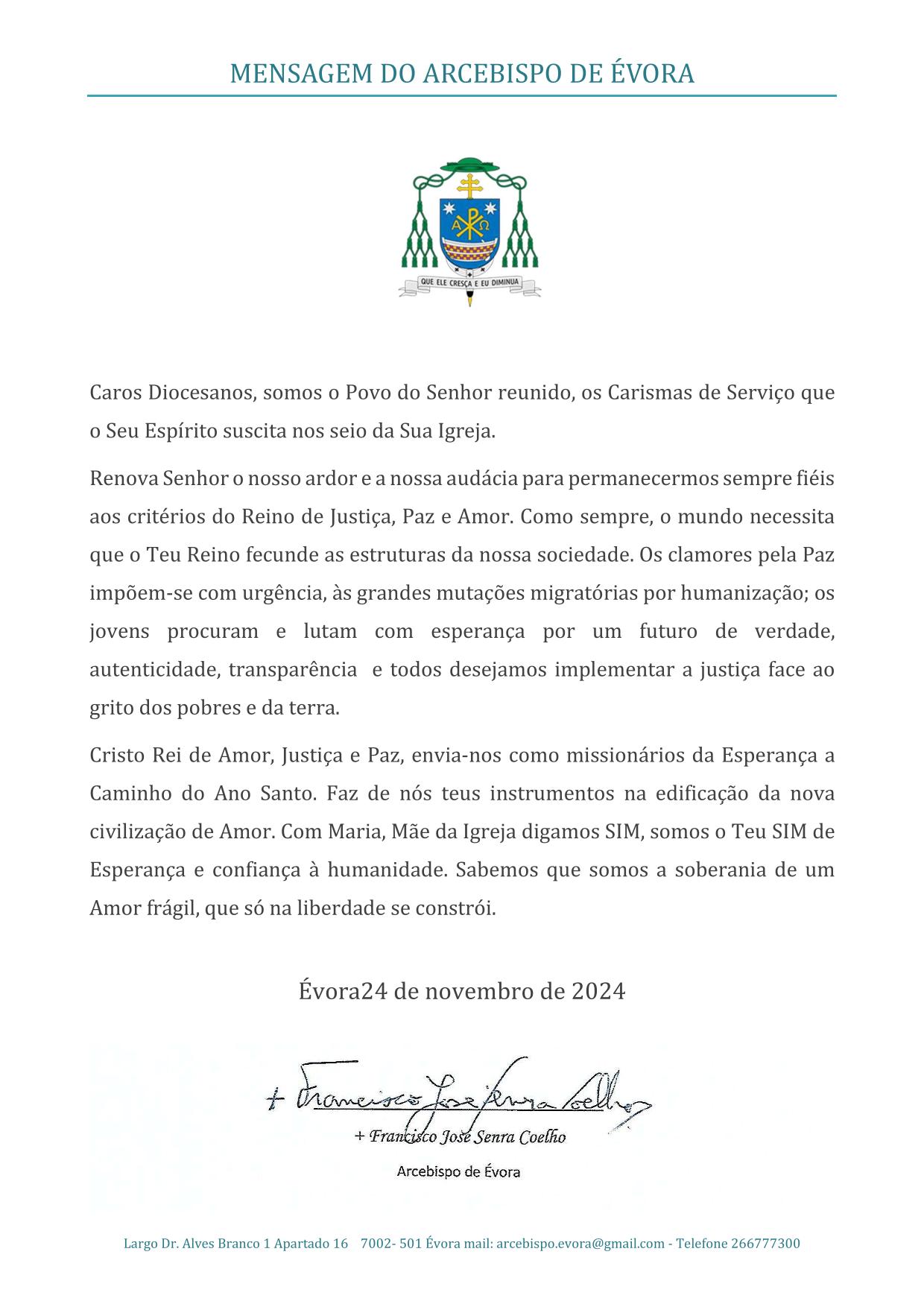 “O reino de Jesus é um espaço de amor e de graça de Deus; é vida nova, perdão universal, mesa posta para todos; o rei Jesus senta-se nela com os pecadores, é irmão de todos, comove-se com a dor e a morte, é o “bom samaritano”, abraça os mais pequenos e diz que o seu reino é dos que são como as crianças”, sublinhou o Cónego José Morais Palos, acrescentando que “neste reino de Jesus quem ocupa o primeiro lugar são os pobres, os excluídos, os esquecidos da história, aqueles cuja voz é abafada pelo ruído dos que se colocam sempre na primeira fila e ocupam todos os dias os blocos noticiosos”