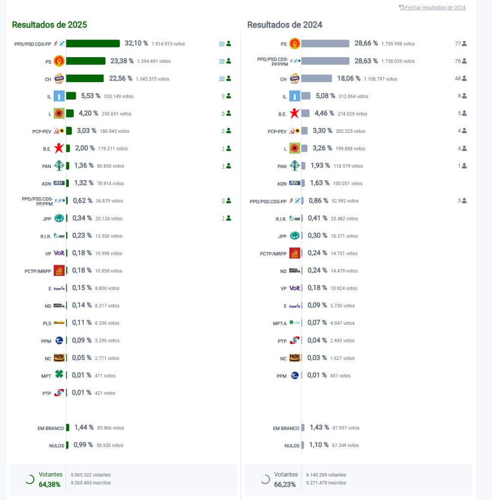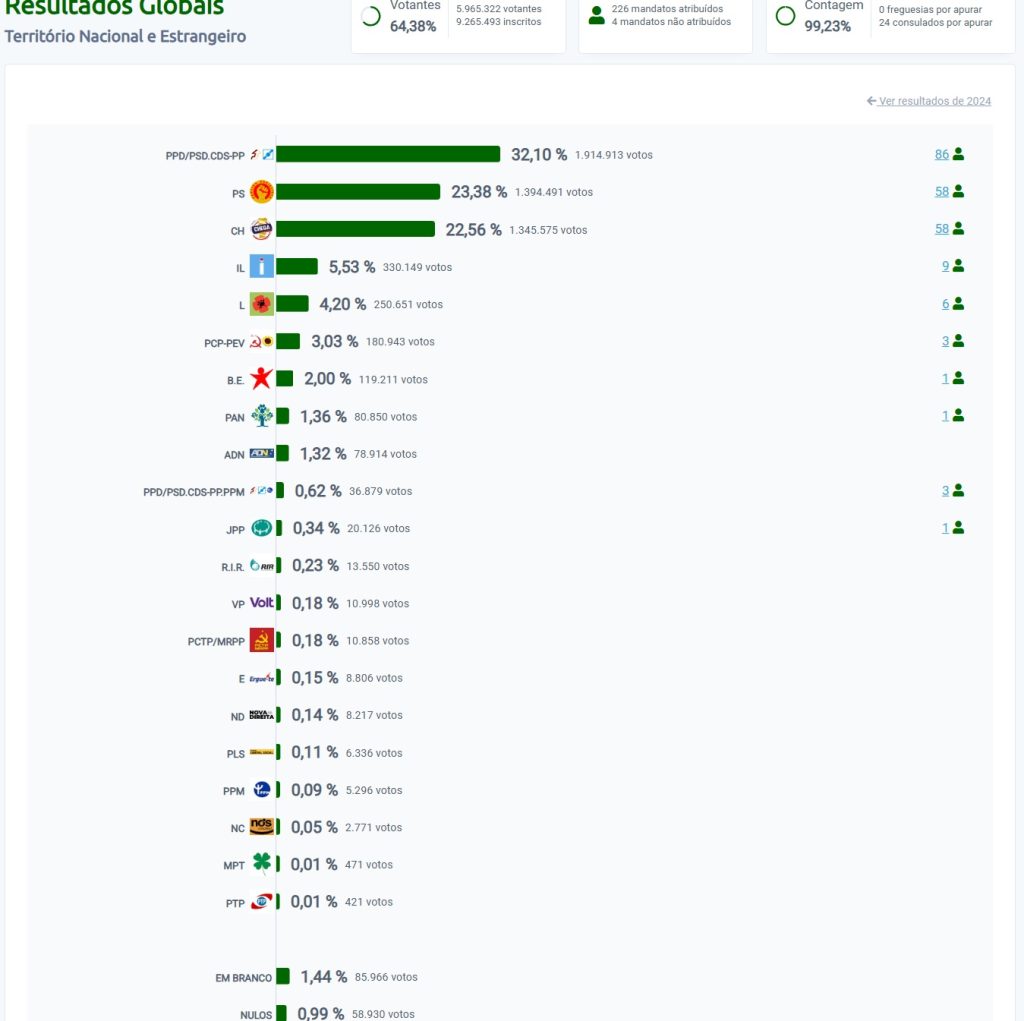 O PS obteve 23,38% e o Chega 22,56%, registando-se uma diferença de 48.916 votos entre estes dois partidos.