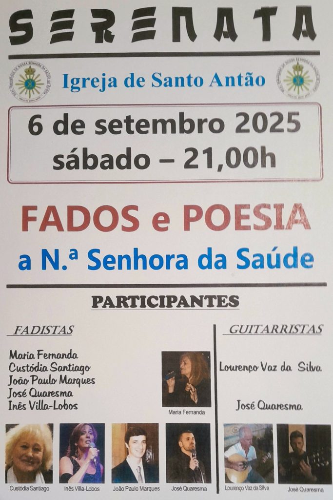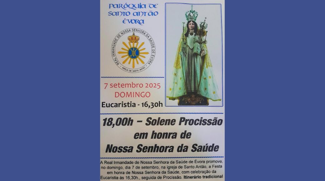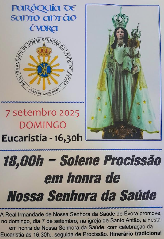 A Mesa Administrativa da Real Irmandade de Nossa Senhora da Saúde de Évora informa todos os irmãos e irmãs que a Festa em honra de Nossa Senhora da Saúde, decorrerá de 3 a 7 de setembro do corrente ano, na igreja de Santo Antão, em Évora.