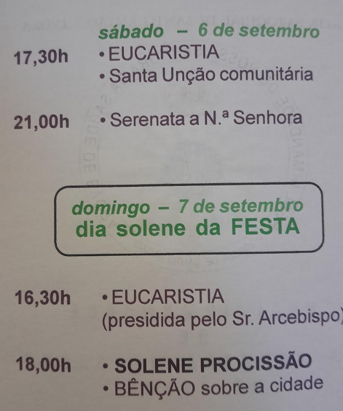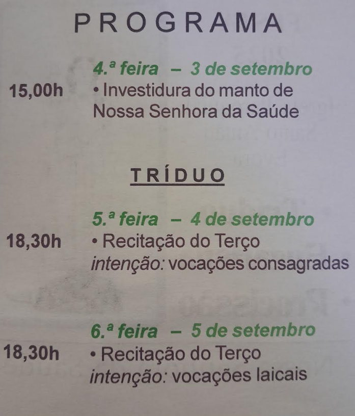 No dia 3 de Setembro, pelas 15:00h, todos os irmãos que puderem devem reunir-se na igreja de Santo Antão, a fim de ajudar a preparar as festas. Nos dias 4 e 5 de setembro, decorrerão os dois primeiros dias do Tríduo, pelas 18:30h, com recitação de Terço e meditação da Palavra, presidida pelo Capelão da Irmandade. No sábado, dia 6 de setembro, celebrar-se-á a Unção dos doentes, durante a eucaristia das 17:30h, presidida pelo Cónego Manuel Maria Madureira (Os irmãos que estejam em situação de receber este sacramento deverão inscrever-se com a D. Anália Ribeiro). Pelas 21:00h, também na igreja de Santo Antão, terá lugar uma Serenata a Nossa Senhora, com fado e poesia.