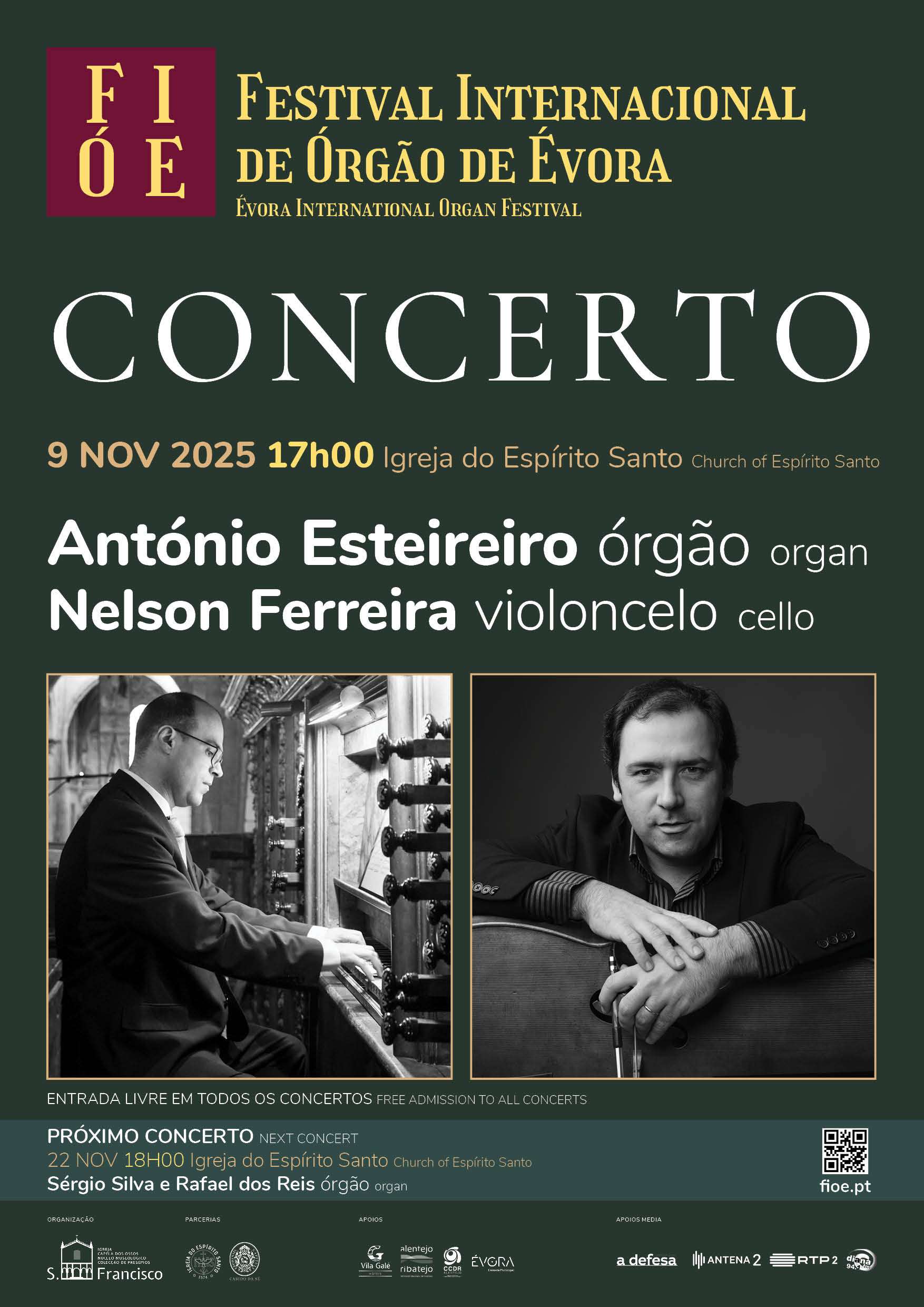 No dia 9 de novembro de 2025, às 17h00, na igreja do Espírito Santo, o organista António Esteireiro e o violoncelista Nelson Ferreira apresentam o seu projeto “Organicordis”, um duo único que combina a majestade do órgão de tubos com a expressividade íntima do violoncelo, criando uma experiência musical profunda e envolvente.